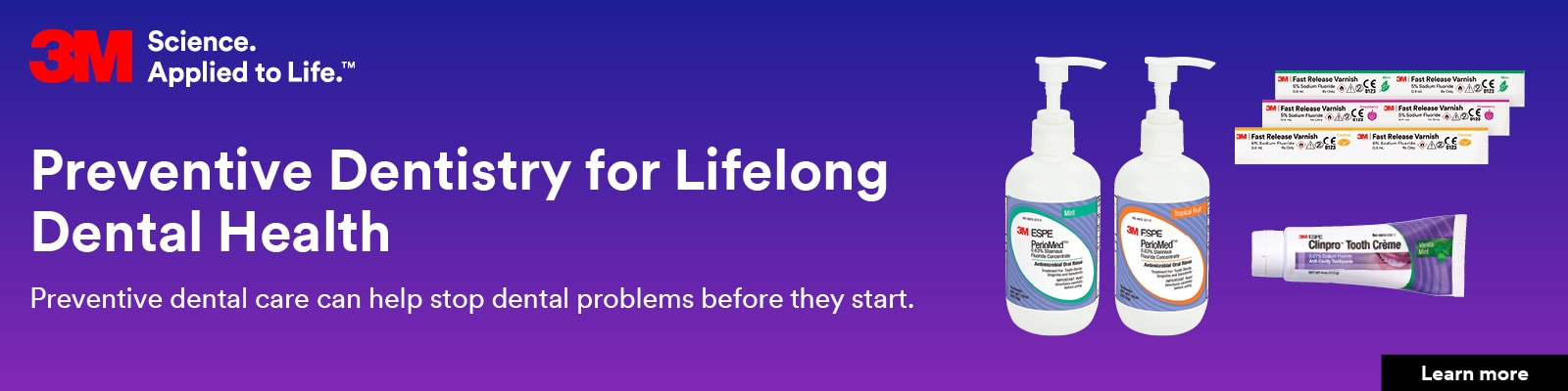 Good preventive dental care for children and adults can help keep your patients healthy and prevent dental problems like cavities, gingivitis, and periodontal disease. 3M offers a range of preventive dentistry products that provide a continuum of care—from cleaning to treatment to protection to maintenance—as well as education and training for dental professionals, and patient materials and videos for promoting preventive dental care in your office.