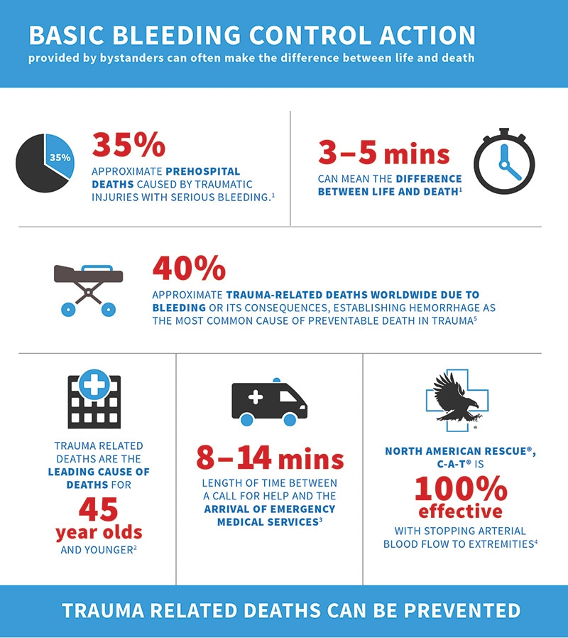 Everyday emergencies, such as automobile accidents, natural disasters, self-inflicted injuries, or shootings, can cause life-threatening bleeding. Bleeding Control Kits from North American Rescue® allow first responders, EMT, law enforcement, and the public to immediately take action and contribute to life-saving efforts.