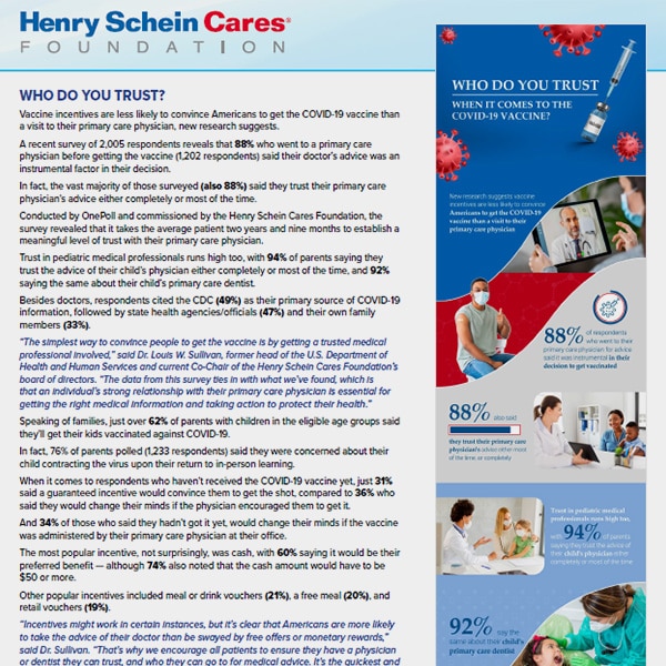 Henry Schein knows the importance of trust, especially when it comes to our health. In fact, a survey commissioned by the Henry Schein Cares Foundation found that respondents were more likely to receive the COVID-19 vaccine after speaking to their primary-care provider.