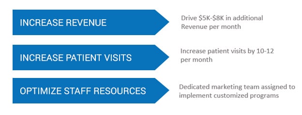 The program provides marketing services designed to increase revenue in areas important to the overall profitability of your practice. It is not just about filling your schedule but assisting you in driving interest in high priority areas.