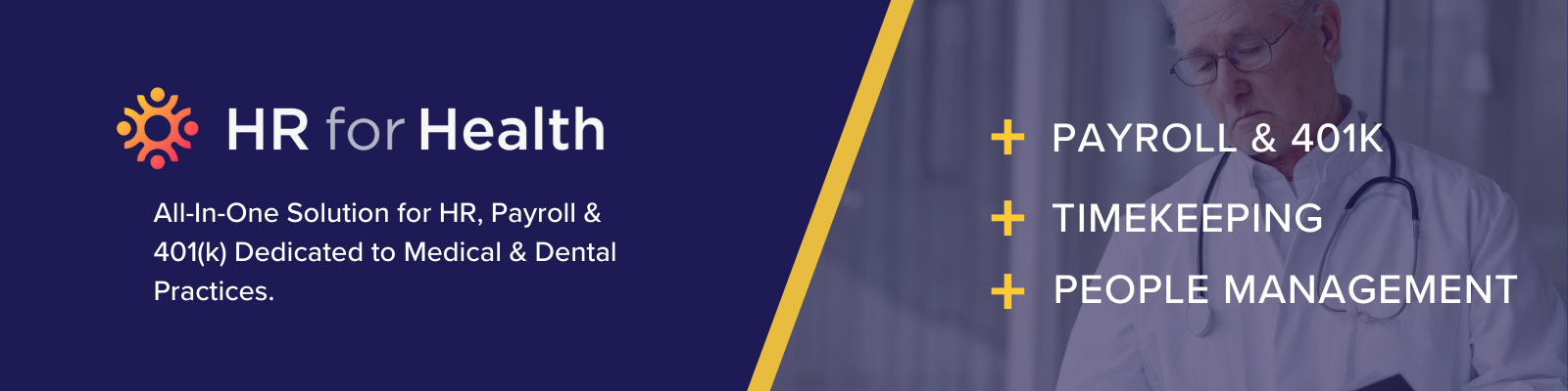 All-In-One HR Solution HR for Health is an all-in-one HR management solution featuring payroll, timekeeping, 401k, employee performance tools, and robust reporting. The integrated platform is a one-stop-shop for medical & dental practices making it easy to login and manage everything in one application.