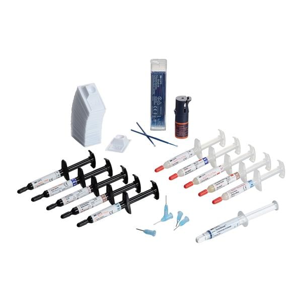 5 - 3 Gm. syringes of RelyX veneer cement (1 of each: A1, A3, white opaque, translucent & B0.5), 5 - 2 Gm. syringes of RelyX™ try-in pastes (1 of each: A1, A3, white opaque, translucent & B0.5), 1 - 5 mL vial of Scotchbond universal adhesive, 1 - 3 mL syringe of Scotchbond etchant, 48 disposable mix wells, 50 black microbrushes, 25 etchant dispensing tips & 1 RelyX veneer shade guide.