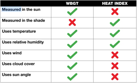 The heat index is a well-known calculation, but according to the National Weather Service, WBGT is a better guide to managing workload in direct sunlight:
