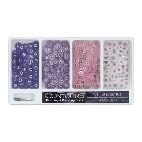 Discs are a color-coded, easy-to-use sequence of 4 semiflexible aluminum-oxide discs, designed to efficiently shape and refine composite restorations. Available in the 2 most popular sizes of 3/8" and 1/2" diameters that effortlessly and securely pop onto a round mandrel. Choose the 3/8" disc for margins and areas near the papilla, as well as on posterior and/or pedodontic restorations. Larger 1/2" disc is perfect for larger surface reduction, contouring, and polishing.