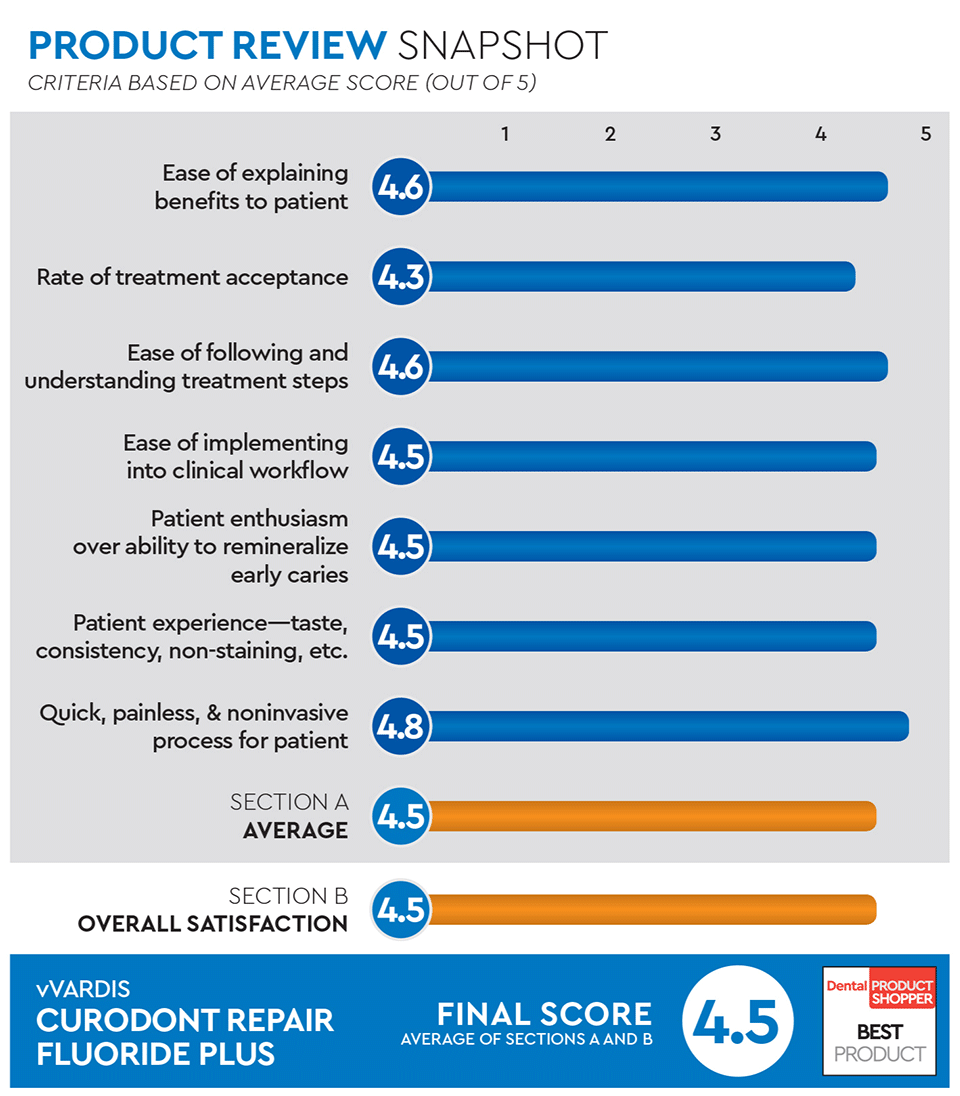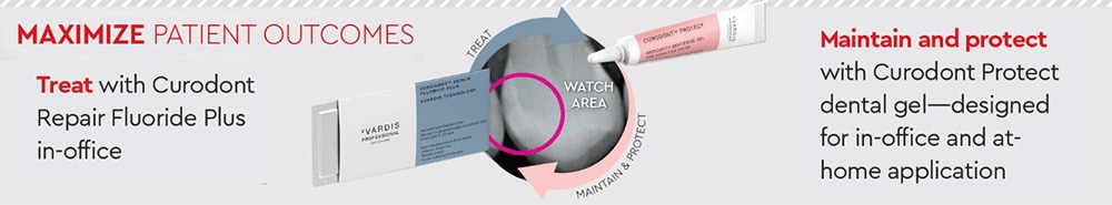 1. What is Curodont Repair Fluoride Plus? Curodont Repair Fluoride Plus is a locally applied formulation for the in-office management of early, non-cavitated caries (watch areas/white spot lesions). 2. How does Curodont Repair Fluoride Plus work? Curodont Repair Fluoride Plus’s proprietary formula diffuses throughout the early carious lesion through capillary action and over time helps attract calcium and phosphate ions found in the saliva to help remineralize the tooth. 3. What are the uses of Curodont Repair Fluoride Plus? Curodont Repair Fluoride Plus is a low-viscosity liquid material that can be used to arrest the progression and enable regression of non-cavitated carious lesions through remineralization. These lesions often appear as white spots on buccal and occlusal surfaces. For proximal lesions, which may not be visually accessible, radiographs and/or advanced diagnostic measures, such as laser fluorescence, fiber-optic transillumination, impedance measurement, etc. may be used. 4. Can Curodont Repair Fluoride Plus ‘fill’ cavities? Curodont Repair Fluoride Plus works on early, non-cavitated carious lesions. Cavitated lesions, which represent an advanced stage of the carious process, must be treated with restorations that require drilling of the tooth. Detection and treatment of caries in their incipient stages with Curodont Repair Fluoride Plus can prevent or delay their progression to cavitated lesions.