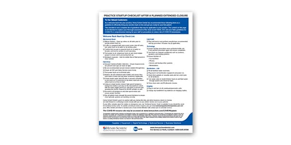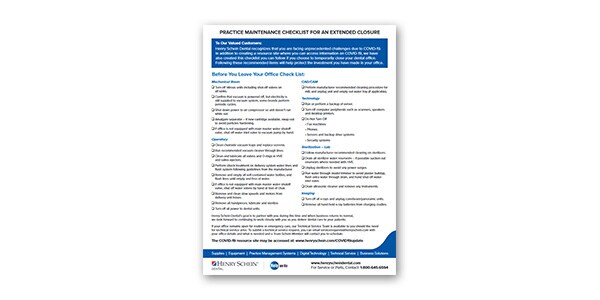 Learn from Daniel Molina, Zone Operations Manager from Henry Schein, as he shares instructional "How To" videos for preparing your equipment and technology for the reopening of your practice after an extended closure. Daniel walks through each area of your office and provides guidance on how to properly restart and power on your equipment. Areas of equipment are: maintenance room, CAD/CAM, operatories, technology, lab, sterilization, imaging; along with a detailed guide to restarting your treatment rooms.