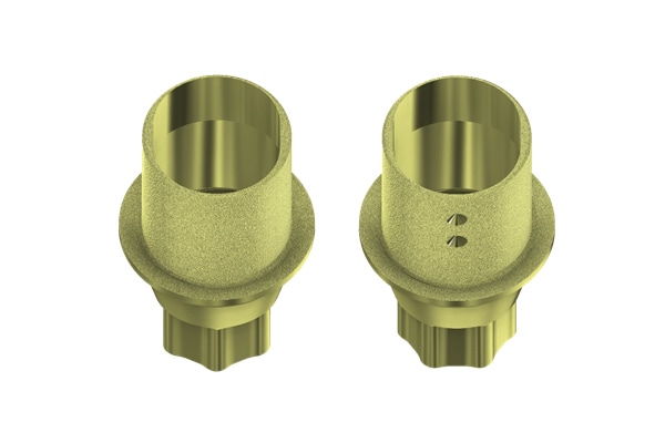 La solución perfecta en la cual necesita ajustar el ángulo del canal del tornillo. Gracias al perfil de forma única se puede lograr una inserción de tornillo en ángulo de hasta 25° con torque completo. AURUMBase® está hecho de titanio grado 5 ELI y está anodizado en oro, lo que mejora las exigencias estéticas. La tecnología SelectGrip® se aplica a las superficies de retención y el diseño se incorpora a las bibliotecas CAD oficiales de DESS® de 3Shape®, Exocad® y Dental Wings®.