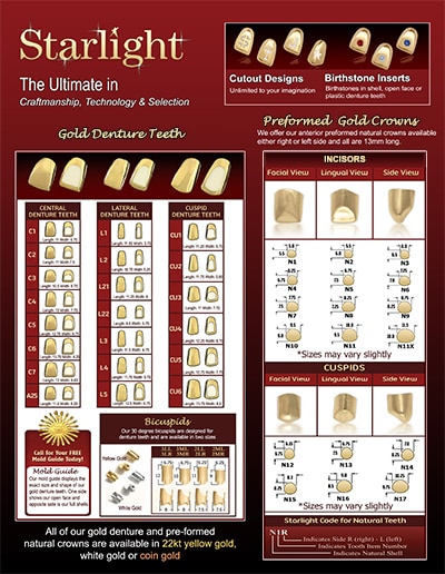For over 30 years, Starlight Manufacturing has been a trusted name in the dental lab industry, specializing in premium gold denture teeth known for exceptional esthetics and craftsmanship. With a large inventory of 22kt yellow gold denture teeth ready for shipment, fast and reliable delivery ensures you get your teeth you need without delay. Looking for custom options? Starlight Manufacturing offers white and coin gold denture teeth as special orders, catering to diverse patient preferences. For those seeking gold coverage for natural teeth, the collection includes 22kt yellow and white gold preformed and custom-fabricated crowns, designed for durability, precision, and sophistication.
